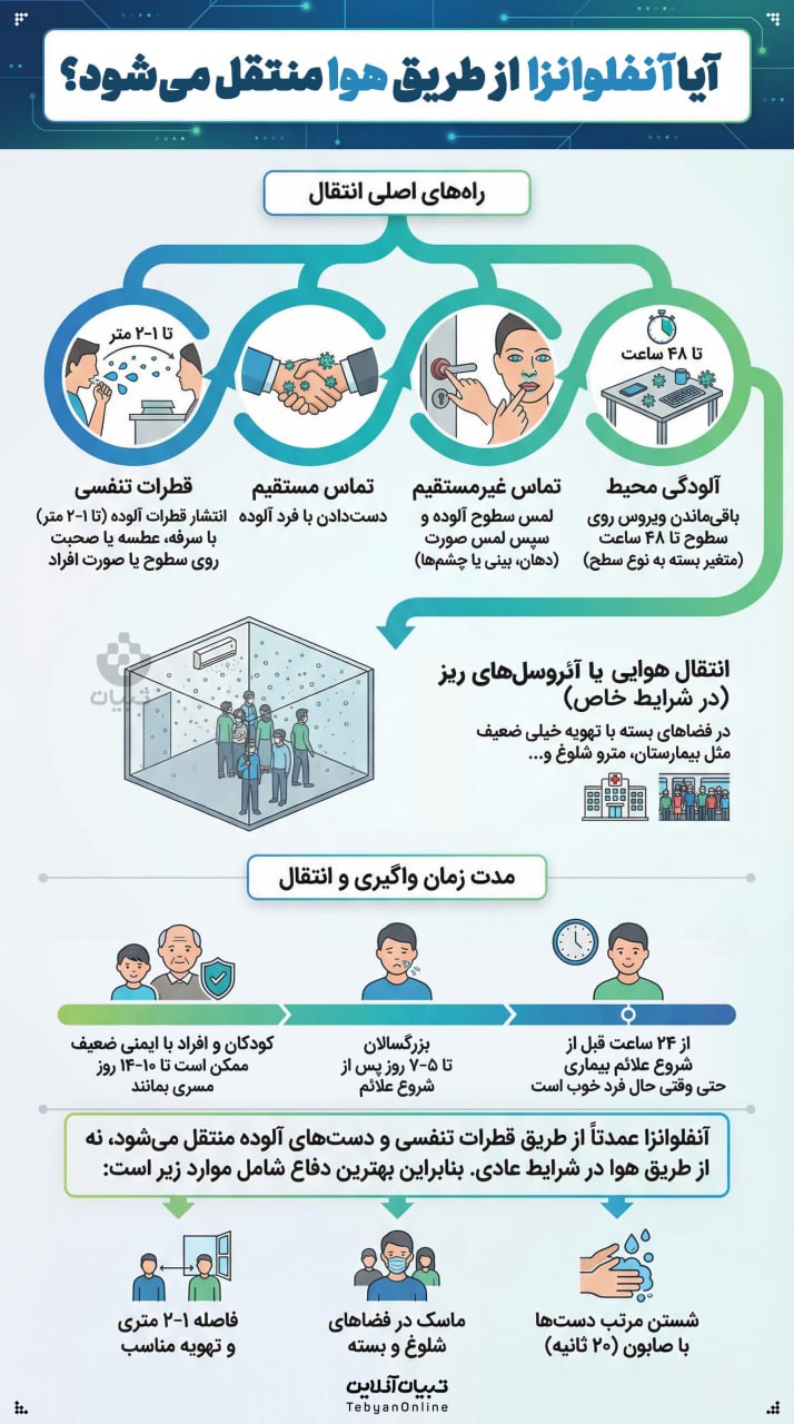 آنفلوانزا عمدتاً از طریق قطرات تنفسی و دست‌های آلوده منتقل می‌شود. برای پیشگیری، شستن دست‌ها، استفاده از ماسک در فضاهای شلوغ و رعایت فاصله‌گذاری اجتماعی و تهویه مناسب ضروری است. مراقب باشید و از انتشار ویروس جلوگیری کنید!