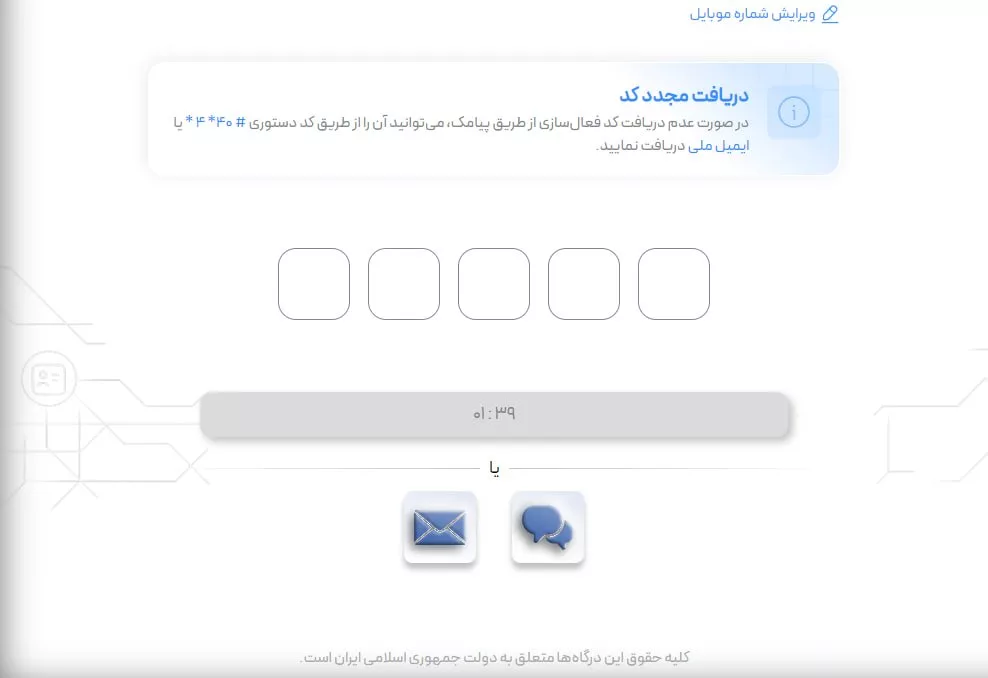 کد تأیید معمولاً به سرعت به سیمکارتی که وارد کردهاید ارسال میشود. اگر کد را دریافت نکردید، کد دستوری #۴۰*۴* را در تلفن همراه خود وارد کنید تا کد دریافت را از طریق USSD دریافت کنید.