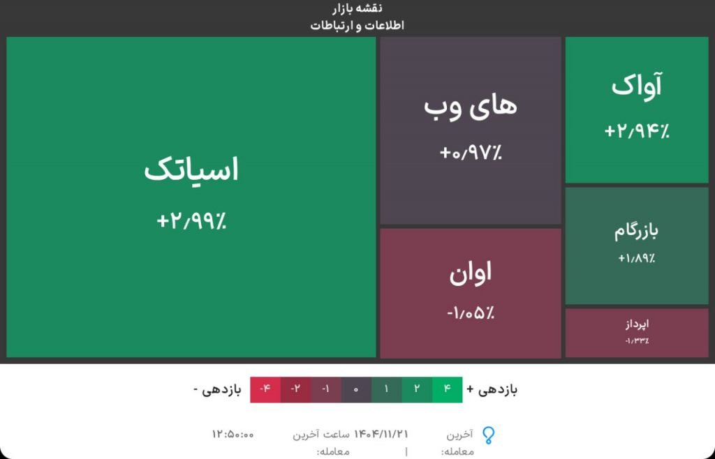 در گروه اطلاعات و ارتباطات نماد‌های مثل اسیاتک، آواک و بازرگام، مثبت معامله شدند.