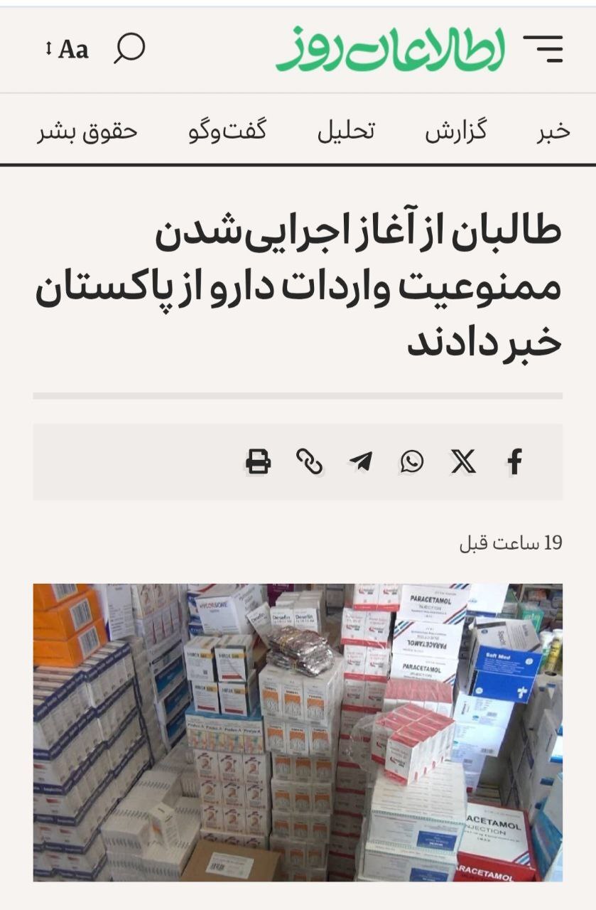 - طالبان از آغاز اجرایی شدن ممنوعیت واردات دارو از پاکستان خبر داد .