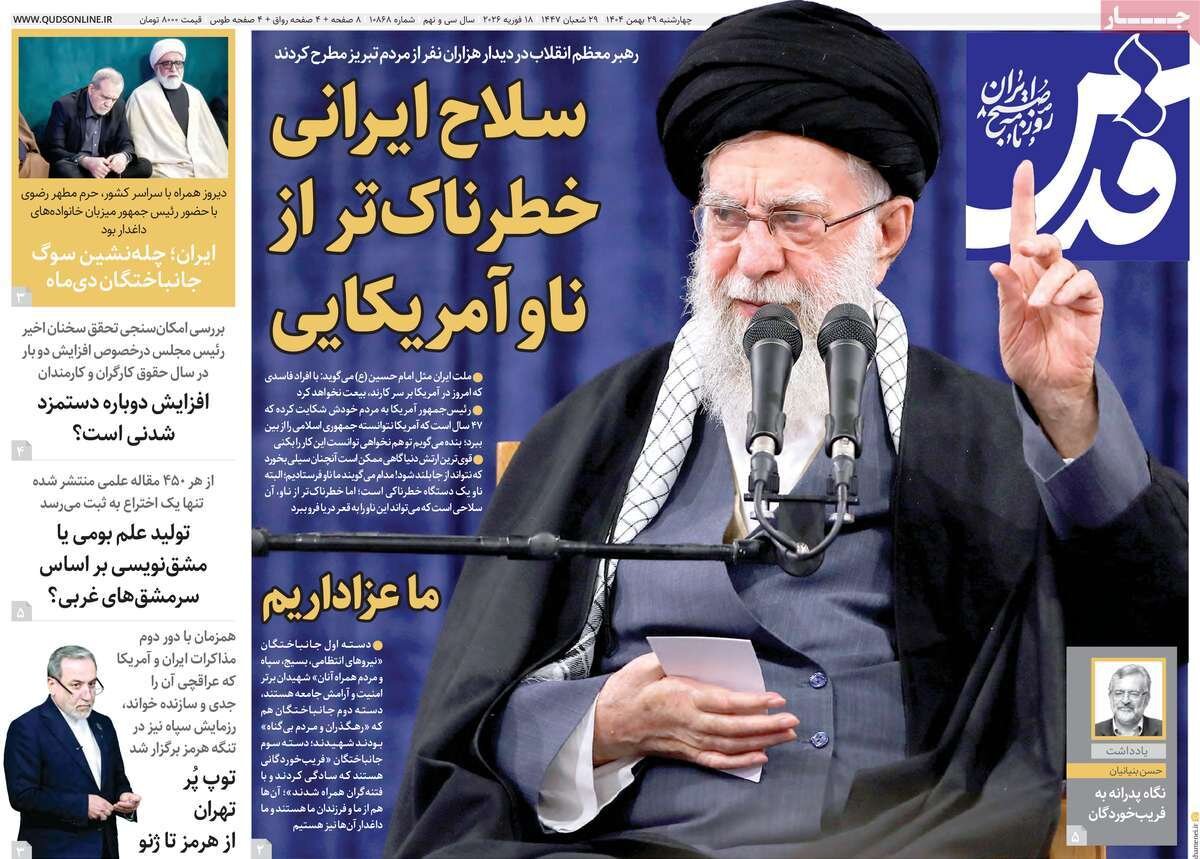 بیانات حماسی رهبرمعظم انقلاب در مورد امریکا، برگزاری مراسم چهلمین روز جاباختگان ناآرامی ها و... از تیترهای مطبوعات امروز است.