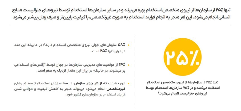 این در حالی است که در سطح جهان، ۵۸ درصد از سازمانها دارای نیروی متخصص برای پیشبرد برنامههای استخدامی هستند. انجام این وظیفه حیاتی توسط نیروهای غیرتخصصی داخلی، نه تنها زمان بررسیها را طولانی میکند، بلکه در نهایت کیفیت خروجی را کاهش میدهد.
