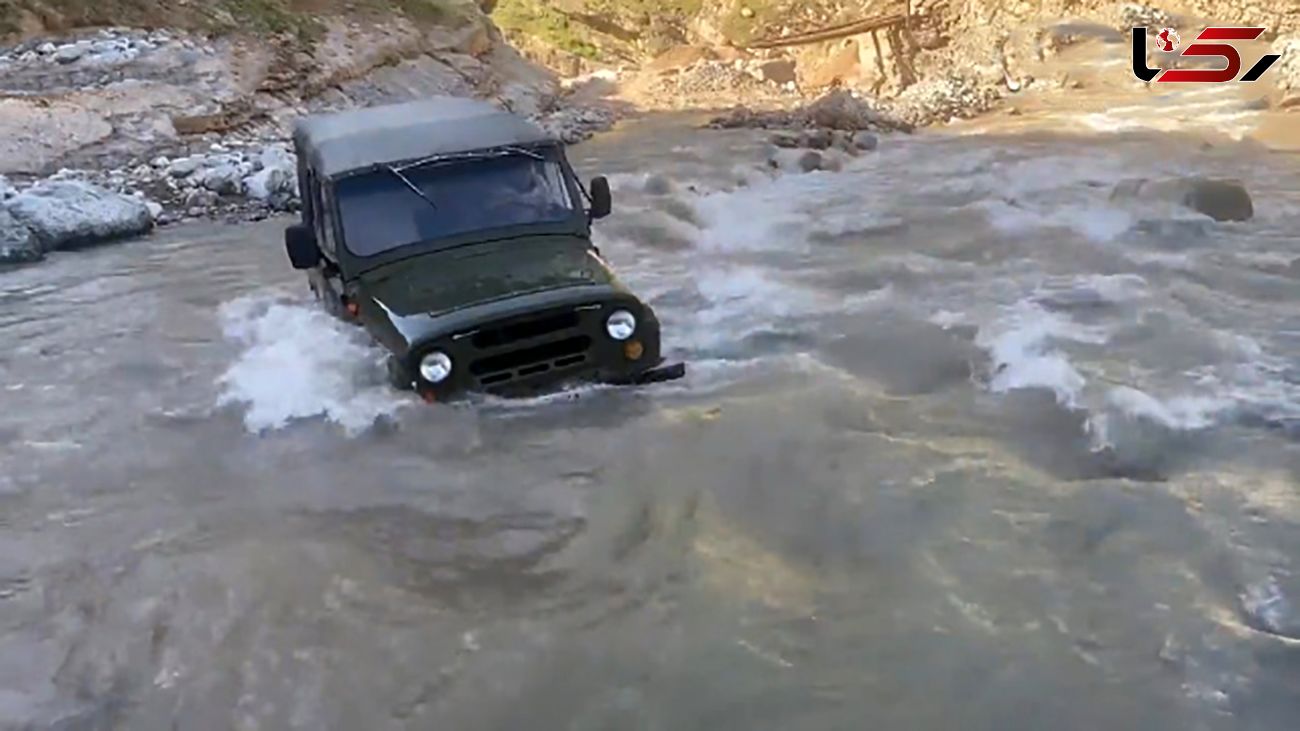 حوادث رکنا:یک خودروی جیپ هنگام عبور از عرض رودخانهای خروشان در ازبکستان متوقف شد.