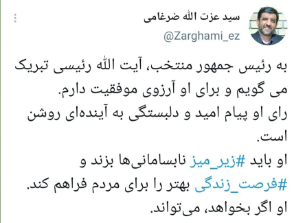 به رئیس جمهور منتخب، آیت الله رئیسی تبریک می گویم و برای او آرزوی موفقیت دارم.