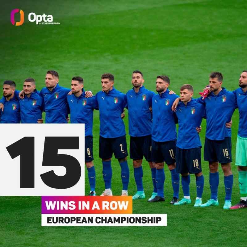 تیم ملی ایتالیا بعد از پیروزی امشب، صاحب یک رکورد دیگر هم شد؛ 15 پیروزی متوالی در دور انتخابی و نهایی جام ملت های اروپا؛ رکوردی که به نظر نمی رسد تا مدت های زیاد، تیمی بتواند آن را بشکند.