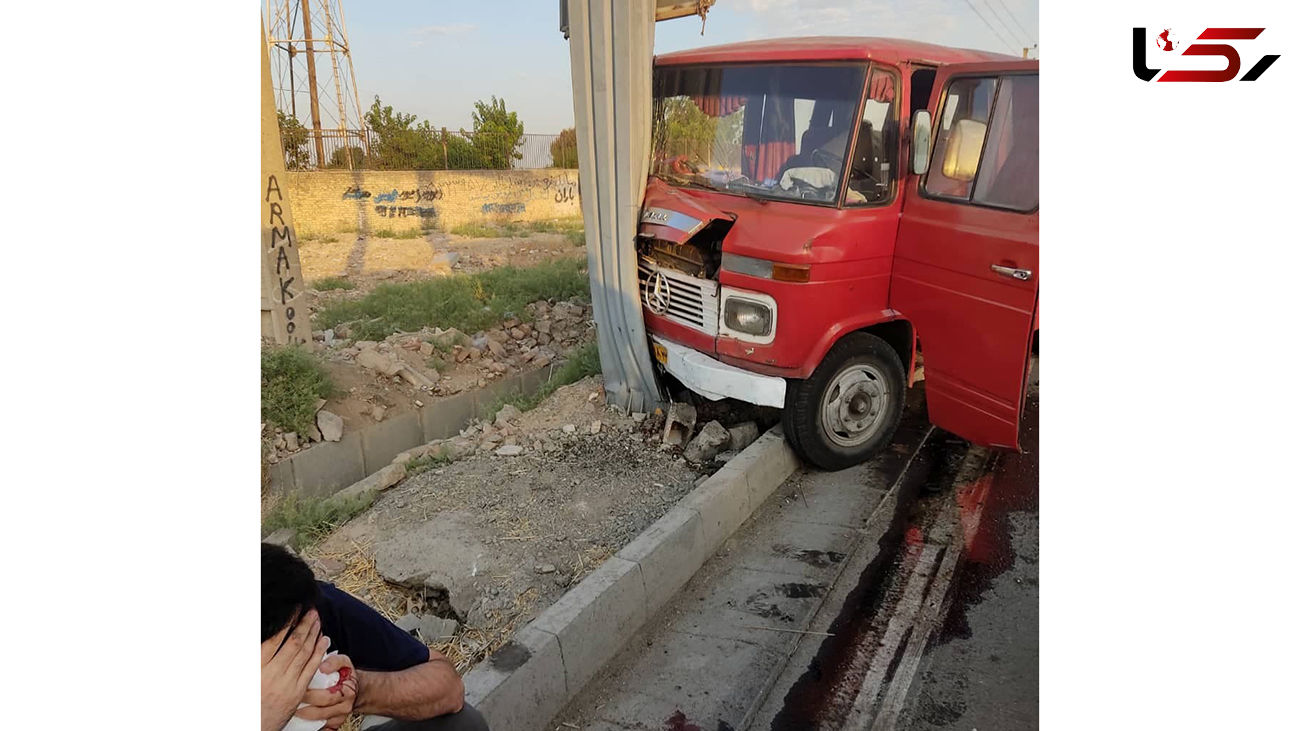 یک دستگاه مینی بوس قدیمی که سرویس حمل یکی از کارخانه های اطراف بوده است با حدود 11 نفر سرنشین از مسیر اصلی خود منحرف شده و با تابلوی جهت نمای راهنمایی برخورد می کند.