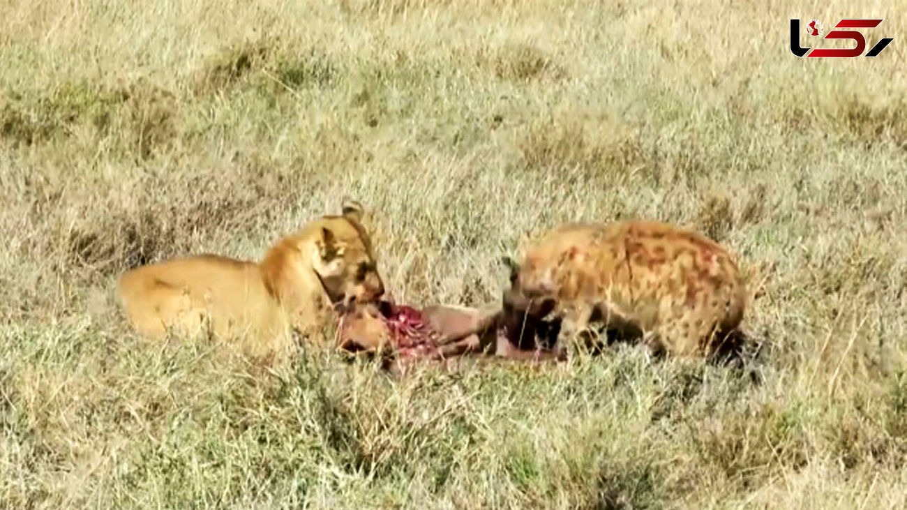 گراز نگون بخت طعمه شیر و کفتار شد. همان طور که در فیلم واضح است یک شیر و کفتار با همکاری یکدیگر یک گراز را شکار کردند.