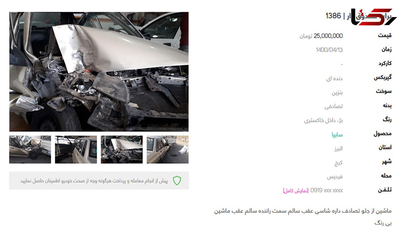 به گزارش اقتصادی رکنا، در آگهی بالا یک پراید تقریبا مچاله شده را مشاهده میکنید که از جلو تصادف شدیدی داشته است. شاید جالب باشد بدانید که برای این خودرو قیمت ۲۵ میلیون تومان در نظر گرفته شده است. پولی که تا چند سال قبل با آن میتوانستید یک خودروی صفر کیلومتر خریداری کنید.
