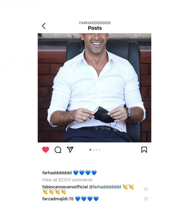 پستی که به سرعت با واکنش کاپیتان سابق تیم ملی فوتبال ایتالیا که سابقه کسب عنوان مرد سال فوتبال اروپا همراه شد و فابیو کاناوارو که رفاقت نزدیکی با فرهاد مجیدی دارد، نشان داد که پیگیر این مسابقه حساس دوست خود هم بوده و برای او نشانه‌های تشویق گذاشت تا این‌گونه به تصویر فرهاد مجیدی در شهرآورد پایتخت واکنش نشان داد.