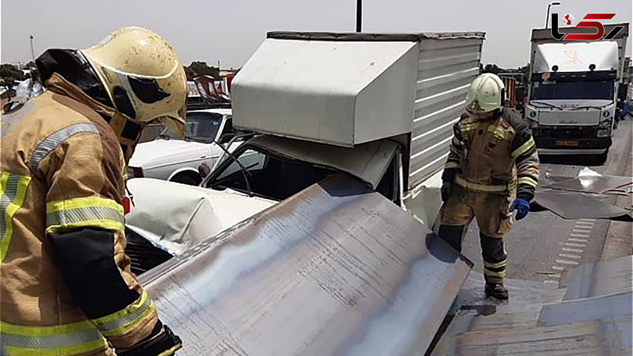 به گزارش رکنا، محسن نجفی فرمانده نیروهای آتش نشانی در این باره گفت: چند دستگاه خودرو باری سبک و سنگین شامل؛ وانت نیسان، وانت پیکان و کامیونت ایسوزو حین حرکت در مسیر به علت نامعلومی با یکدیگر برخورد کرده بودند که براثر این حادثه، ورق های فلزی در قسمت بار خودرو وانت نیسان بر روی خودرو وانت پیکان سقوط کرده بود.