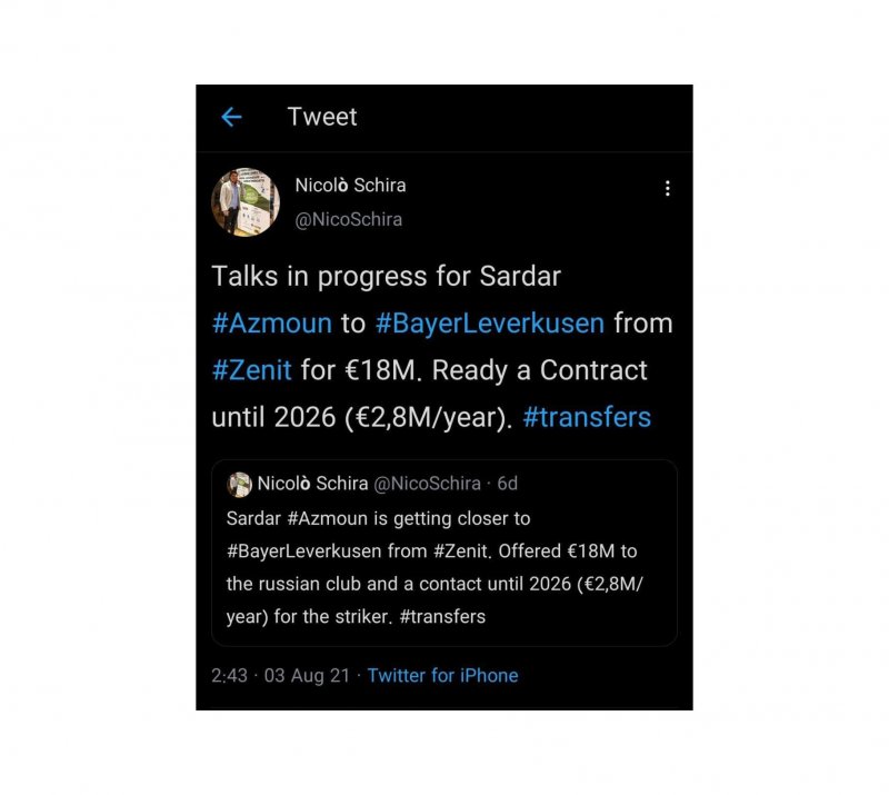 اما ساعاتی پیش نیکولو شیرا خبرنگار معروف ایتالیایی و روزنامه نگار گاتزتا دلو اسپورت در توئیتر خود مدعی شد که هنوز لورکوزن از خرید آزمون منصرف نشده است. شیرا نوشت: مذاکرات برای انتقال سردار آزمون از زنیت به لورکوزن با مبلغ 18 میلیون یورو در حال انجام است. قرارداد تا سال 2026 و دستمزد سالیانه 2.8 میلیون یورو آماده است.