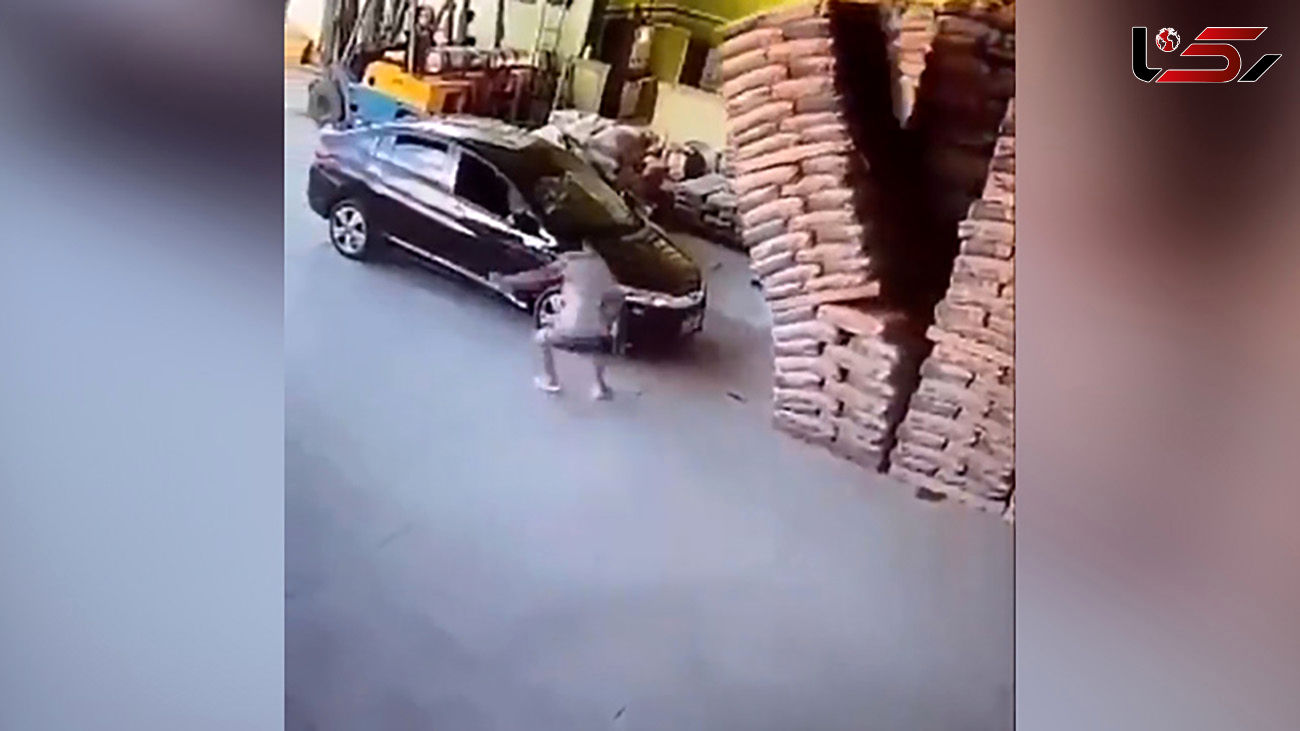 چند کارگر در کارگاهی در چین مشغول کار بودند که حادثهای مقابل چشمانشان رخ داد. کیسههایی که چیده شده بودند روی خودرویی که در کارگاه توقف کرده بود، سقوط کرد. البته سرنشین خودرو در این حادثه آسیب جانی ندید.