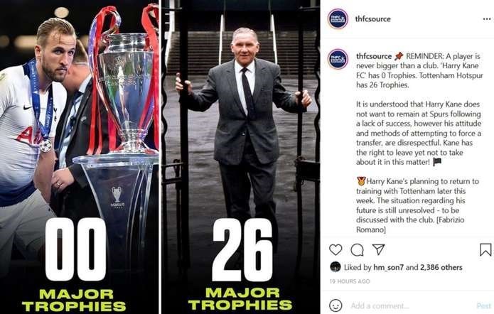 در یکی از پست‌ها، یکی از هواداران تصویری از کین و بیل نیکلسون موفقترین سرمربی تاریخ تاتنهام را از لحاظ تعداد افتخاراتی که برای این تیم به ارمغان آورده‌اند، با یکدیگر مقایسه کرده و نوشته است: یک بازیکن هرگز از یک باشگاه بزرگتر نیست. تیم فوتبال هری کین صفر جام، تاتنهام 26 جام.