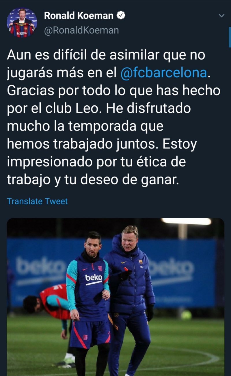رونالد کومان، سرمربی بارسلونا، در صفحه توئیتر خود به جدایی لیونل مسی از این تیم واکنش نشان داد.