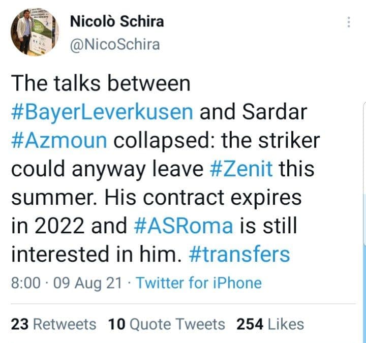 به گزارش ورزش سه، در شرایطی که گفته میشد بایرلورکوزن و بوندسلیگا مقصد بعدی سردار آزمون خواهند بود اما سنگ ۲۰ میلیون یورویی زنیت جلوی پای باشگاه آلمانی، باعث شد تا این انتقال منتفی شود و حالا نیکولا شیرا از پایان مذاکرات بین طرفین خبر داده است.
