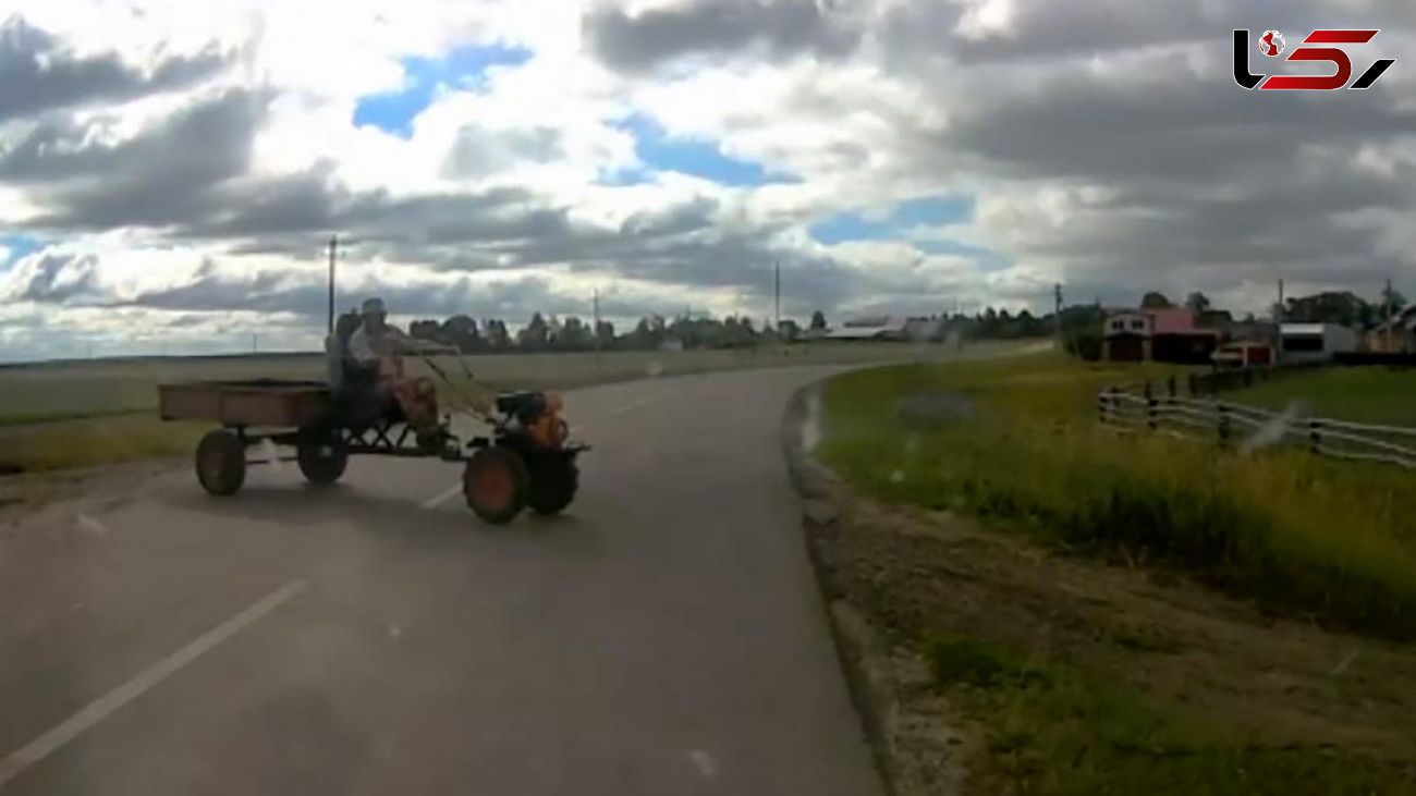 به گزارش رکنا، یک راننده در جادهای روستایی در روسیه مشغول رانندگی بود که با ظاهر شدن ناگهانی تراکتور شگفت زده شد. او تلاش کرد تا از جلوی این تراکتور دوچرخ عبور کند اما موفق نشد و با آن برخورد کرد.