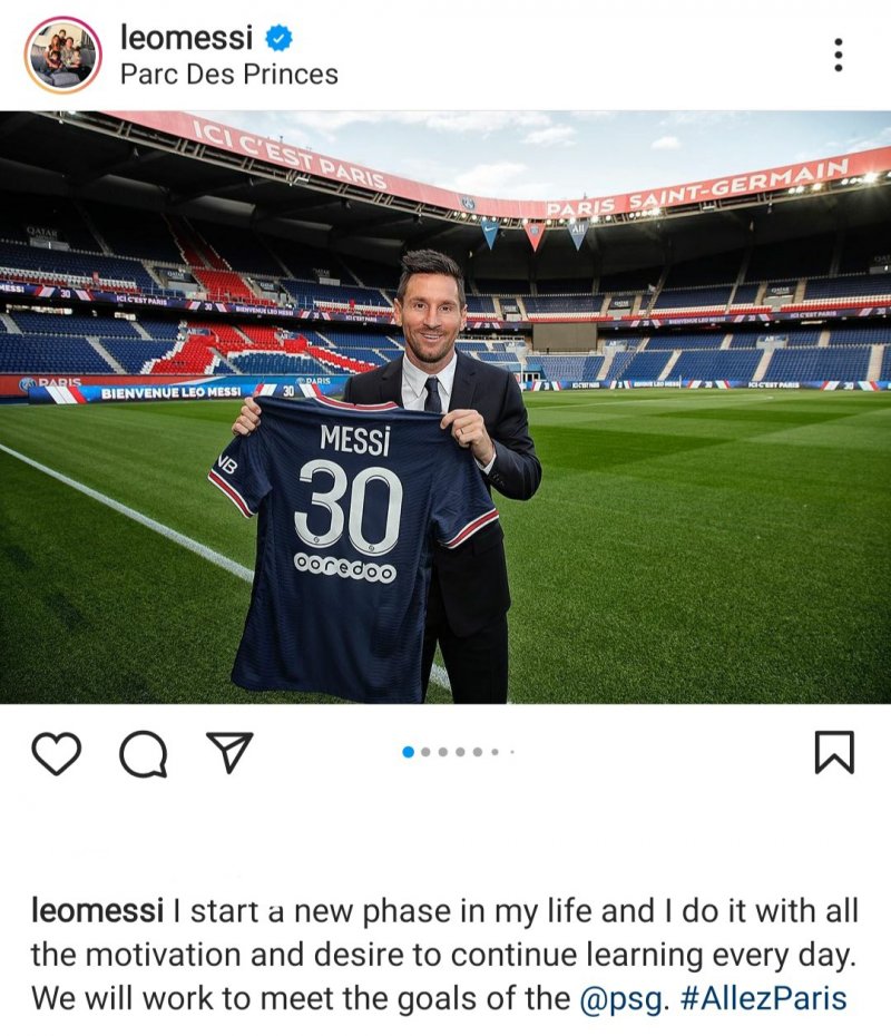 مراسم معارفه لیونل مسی امروز به شکل رسمی برگزار شد و او در یک کنفرانس مطبوعاتی از حضور در پاریسن ژرمن ابراز خوشحالی کرد. مسی حالا در صفحه اینستاگرام خود نیز به حضور در تیم فرانسوی واکنش نشان داده و نوشته است: "من مرحله جدیدی را در زندگی خود شروع می کنم و این کار را با تمام انگیزه و تمایل برای ادامه یادگیری روزانه انجام می دهم. ما برای تحقق اهداف PSG تلاش خواهیم کرد."