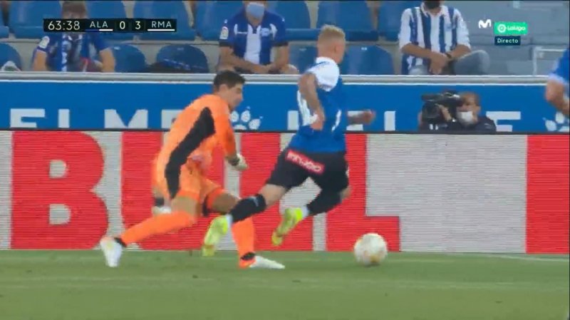 ادر میلیتائو روی ارسال بلند بازیکن تیم آلاوس، با پاس رو به عقبی که از ضرب کافی برخورد نبود، سعی در رساندن توپ به تیبو کورتوا داشت اما یان گویدتی، مهاجم تیم حریف سریع تر خود را به توپ رساند و در حالی که سعی در دریبل دروازه بان رئال داشت با خطای او تعادل خود را از دست داد. داور بازی با پنالتی تشخیص دادن این صحنه به کورتوا کارت زرد نشان داد.