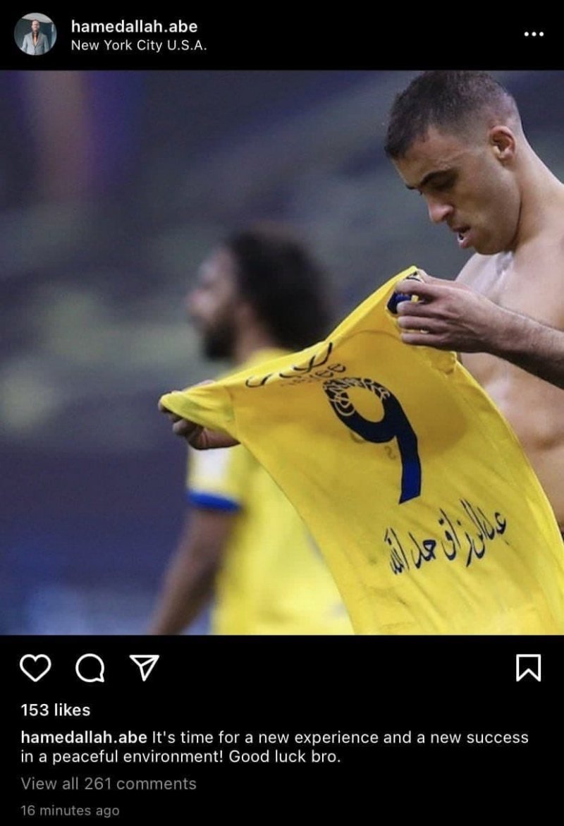 این پست اینستاگرامی حسابی فضای مجازی عربستان را به خود مشغول کرد و چند صفحه خبری مدعی شدند که حمدالله از مدیریت تیم درخواست کرده که حتما در لیست آسیایی این تیم برای مراحل باقیمانده لیگ قهرمانان آسیا حضور داشته باشد اما نظر مانو منزس سرمربی النصر روی وینسنت ابوبکر مهاجم جدید و کامرونی این تیم است چرا که حمدالله به دلیل 2 کارته بودن برابر تراکتور غایب است و منزش قصد ندارد برای این بازی ریسک کند و بدون مهاجم اصلی به میدان برود. همین مسئله باعث شده تنش های میان این مهاجم مراکشی و مربی برزیلی افزایش یابد و اکنون عبدالرزاق حمدالله بیشتر از هر زمان دیگری به درب های خروج از النصر نزدیک است.