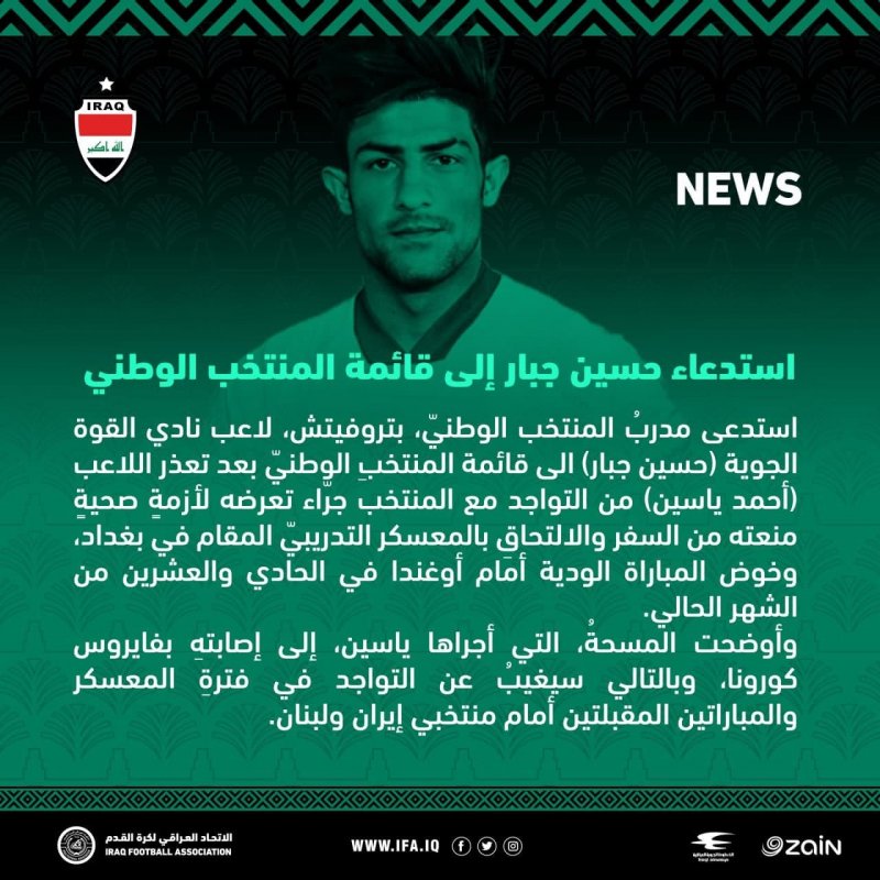 وب سایت شفق نیوز عراق در این رابطه نوشت: پس از ابتلای احمد یاسین به ویروس کرونا، امروز دوشنبه زلیکو پتروویچ سرمربی تیم ملی عراق، حسین جبار بازیکن باشگاه نیروی هوایی را به تیم ملی دعوت کرد.