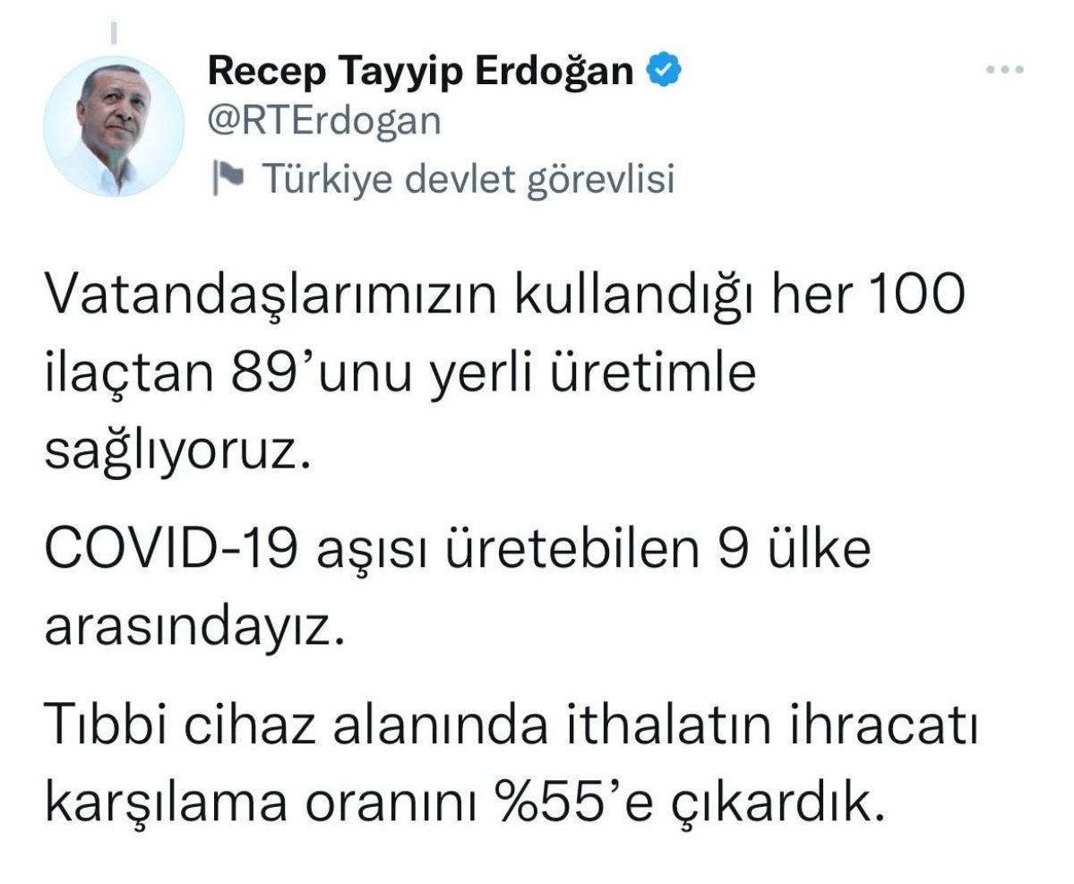 اردوغان: از هر ۱۰۰ دارویی که شهروندانمان استفاده می کنند ۸۹ تایشان داخلی است. جزء ۹ کشور تولید کننده واکسن کووید ۱۹ هستیم.