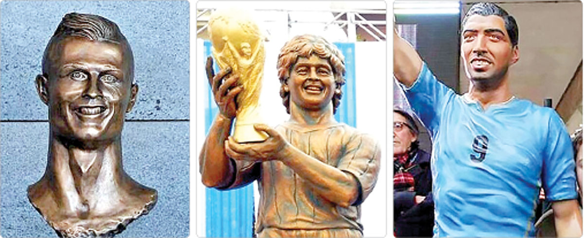 کریستیانو رونالدو در زمین فوتبال زیبا و در بیرون از آن از نظر ظاهری شیک و پرزرقوبرق جلوه میکند؛ با اینهمه نمیتواند به مجسمهای که به افتخارش در پرتغال ساخته شده است، ببالد. مجسمه ستاره منچستریونایتد در فونچال در جزیره مادیرا ساخته شد. البته خالق این اثر، امانوئل سانتوس، از کار خود دفاع کرده و گفته است انتظار ندارد همه از کاری که او ساخته راضی باشند. او در مصاحبهای با گاردین گفت: «آنچه مهم است تاثیری است که این کار ایجاد کرد. همیشه نگاههای متفاوت وجود دارد. من برای همه اینها آماده بودم.» لوئیس سوارز، بازیکن سابق بارسلونا، هم در تیم باشگاهی و هم در کشورش اروگوئه از احترام بسیار بالایی برخوردار بود اما مجسمهای که برای ادای احترام به او ساخته و نصب شد، بیشتر به توهین شباهت دارد تا تحسین. تندیس این فوتبالیست در خارج از یک مرکز خرید در زادگاهش سالتو نصب شده است. سوارز ممکن است بین فوتبالیستها چندان خوشتیپ نباشد، اما مجسمهای که از او ساخته شد هم بازتابی مناسب از ظاهر او نیست.
