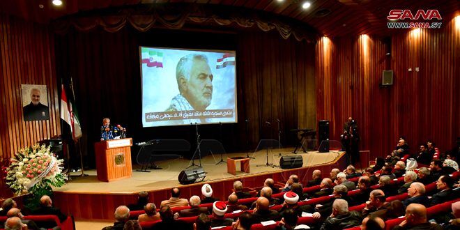تصویری از مراسم یادبود سردار سلیمانی در کتابخانه ملی الاسد در دمشق