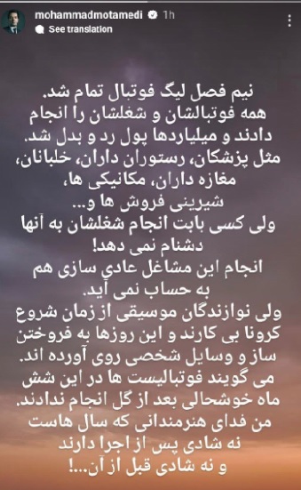 استوری محمد معتمدی خواننده کشورمان به تناقضات سلبریتی‌های کاسب +تصویر