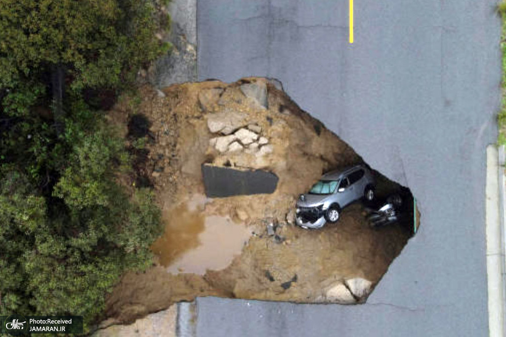 سقوط دو وسیله نقلیه به درون چاله براثر رانش زمین در کالیفرنیا + عکس