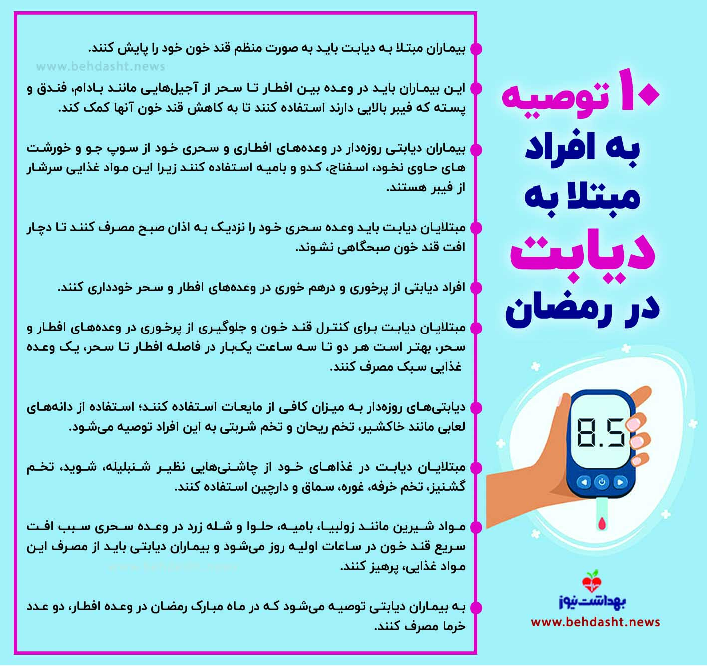 ۱۰ توصیه به افراد مبتلا به دیابت در ماه رمضان+ اینفوگرافی | اختصاصی