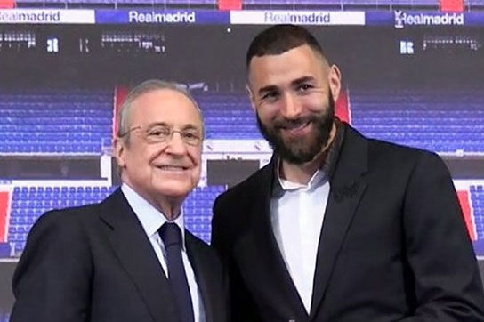 بعد از پخش تصاویر مربوط به دوران حضور بنزما در رئال، فلورنتینو پرز پشت تریبون قرار گرفت تا برای حضار صحبت کند.