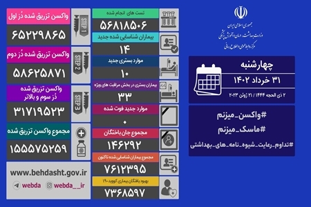 از دیروز تا امروز ۳۱ خردادماه ۱۴۰۲ و بر اساس معیارهای قطعی تشخیصی، ۱۴ بیمار جدید مبتلا به کووید۱۹ در کشور شناسایی و ۱۰ نفر از آنها بستری شدند.