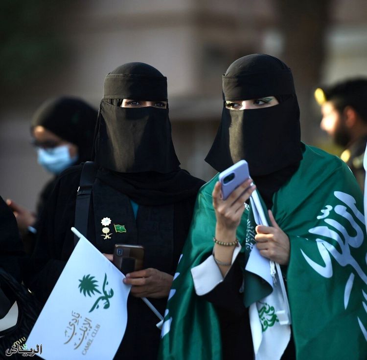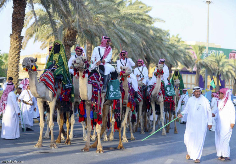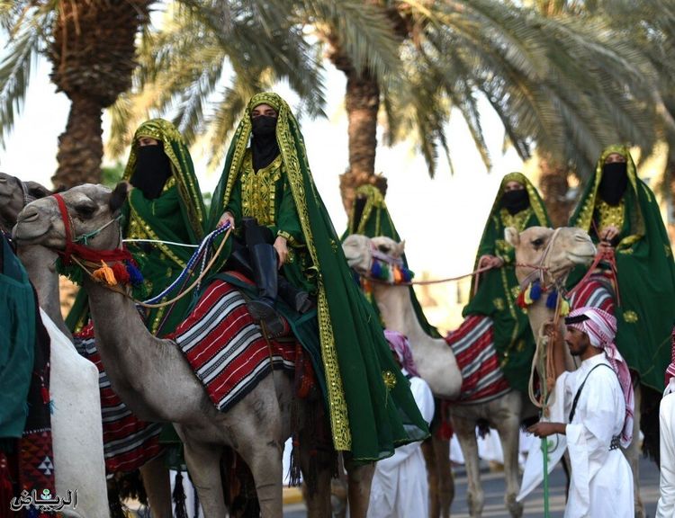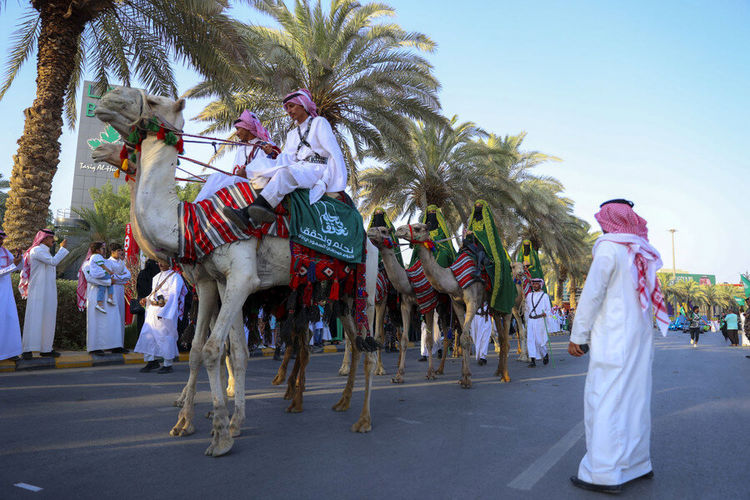 مردان و زنان عربستان سعودی به مناسبت روز ملی این کشور در خیابات التحلیه در ریاض پایتخت این کشور با شتر راهپیمایی کردند. منبع: شفقنا
