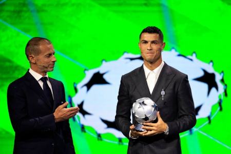 امروز در آغاز مراسم قرعهکشی فصل جدید لیگ قهرمانان کریس رونالدو روی صحنه رفت و جایزه ویژهای از چفرین رئیس یوفا دریافت کرد. جایزهای برای تمجید از او به عنوان بهترین گلزن رقابتها.